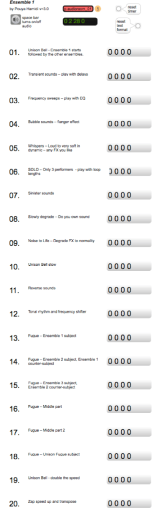 The conductor patch does not generate any sound but sends precisely timed triggers to each individual ensemble using the UDP network protocol. The triggers occur sometimes in unison and sometime at different times. This creates the potential to have the ability for this computer-based orchestra to play the same pattern in unison at the same time. The conductor has the ability to change the timings of each cue on the fly. He can also change control parameters (like cue 20th explained earlier). There is also an emergency stop-audio and start-audio button that send multiple messages to the orchestra if everything goes wrong.